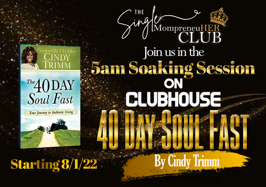 1) We will be covering each chapter of "The 40 Day Soul Fast: Your Journey to Authentic Living" by Cindy Trimm beginning 8/1/22 @ 5:00 am in the Single MompreneuHER Club on Clubhouse. (No you do not have to be a single mother to be a part.